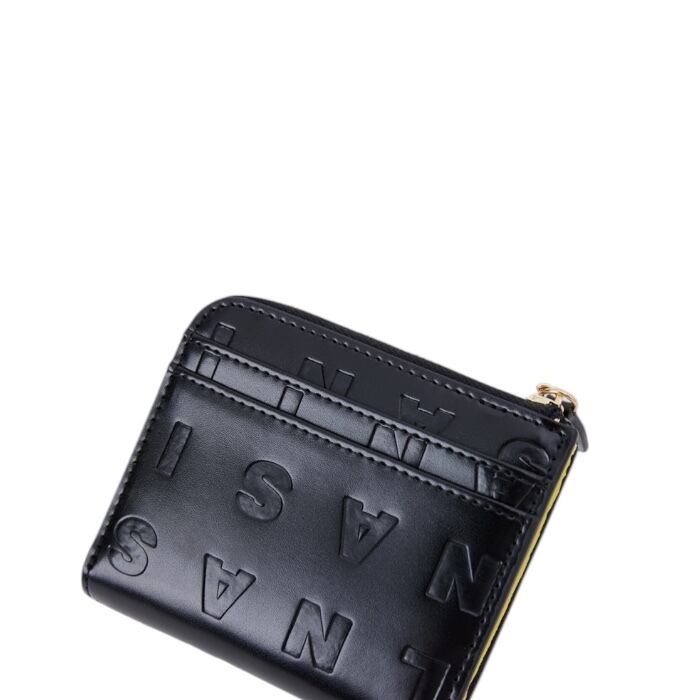 型押しのロゴが施されていることで、シンプルながらも 存在感のあるデザインに。 カード、お札、小銭もしっかり収納可能。 使いやすさを追求したL型短財布です。 牛革のエナメル加工を施し、耐久性も抜群。