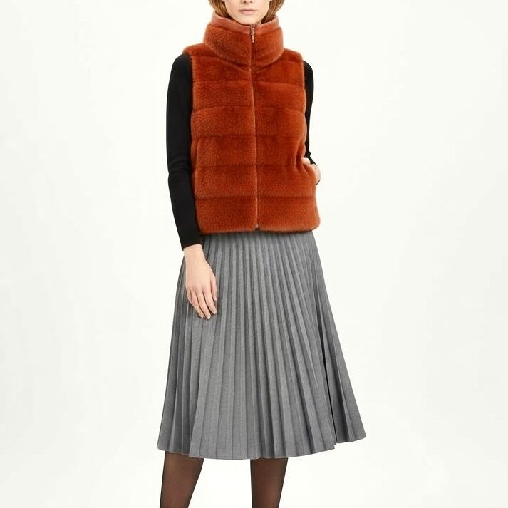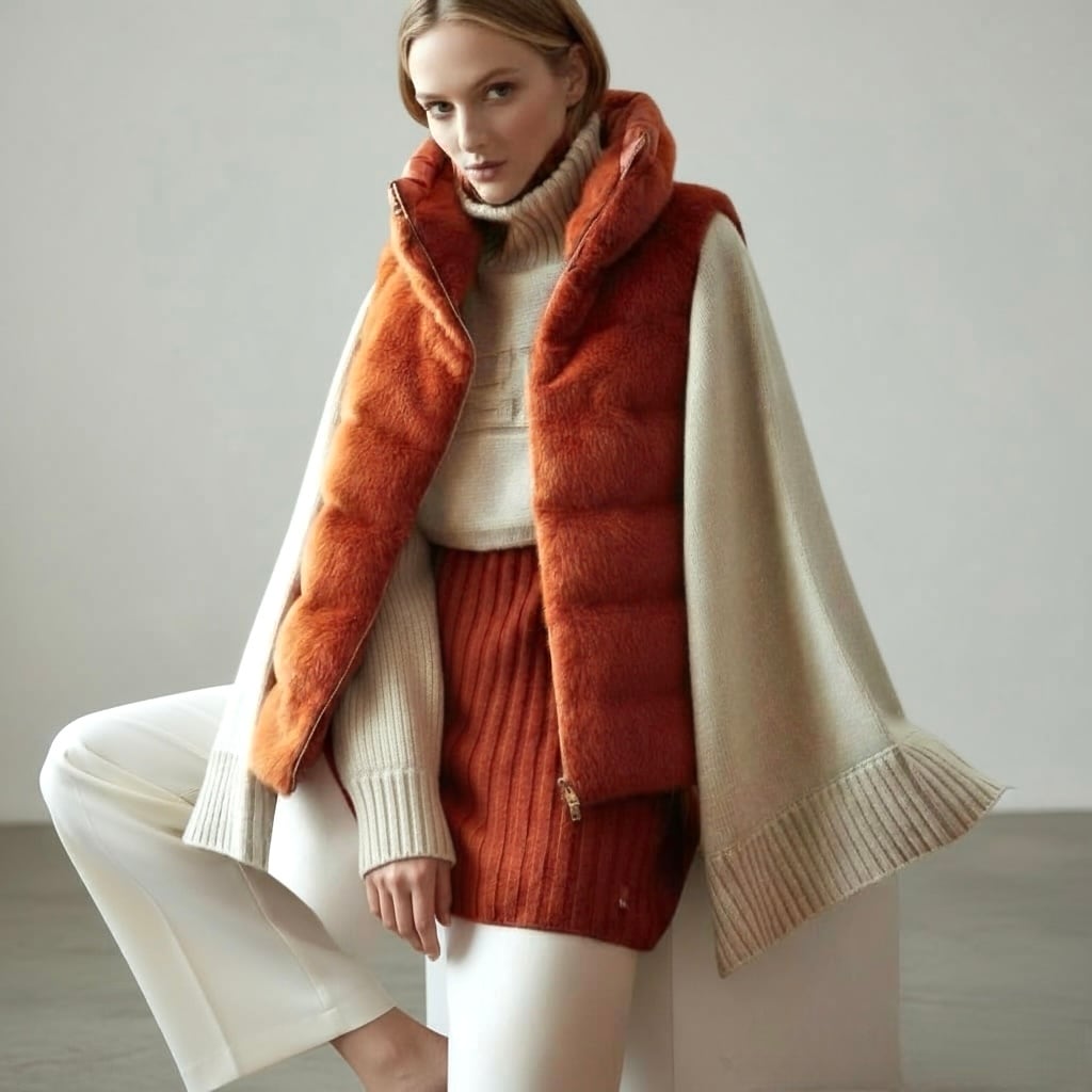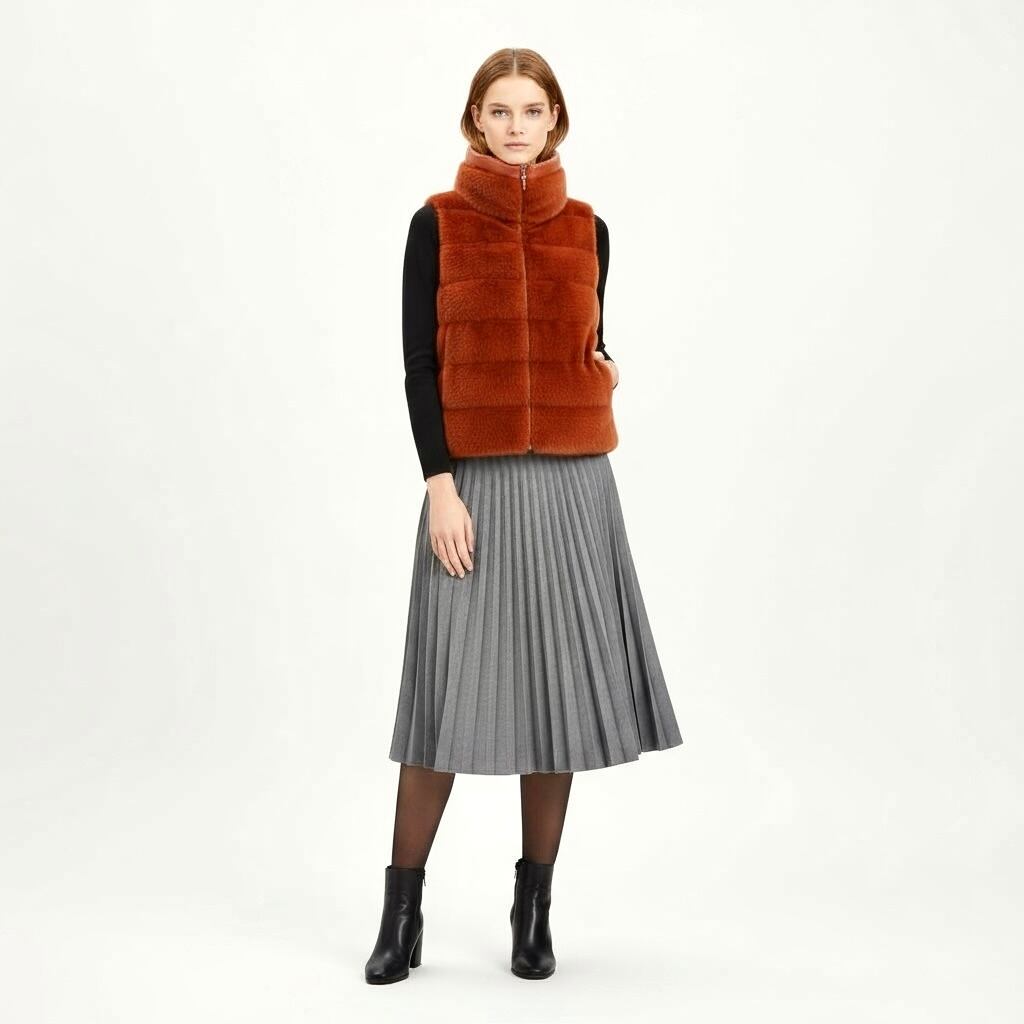 ヌートリアのような贅沢な柔らかさのフェイクファーを使用したベスト。スムースなタッチのショートヘアが特徴です。季節の変わり目のレイヤードスタイルに最適な一着。裏地にはヘルノのアイコン素材であるナイロンウルトラライトを採用し、ヘルノの伝統的なスタイルを最も純粋な形で表現しています。独自の技術で20デニールの日本製ナイロンにダウン80%フェザー20%の中綿を注入し、さらに軽量化を実現。その結果、優れた撥水性とシルクのような滑らかな触り心地を両立しています。 レギュラーフィット ダウンフェザーの中綿入り スタンドカラー サイドにシームポケット ダブルジップで開閉
