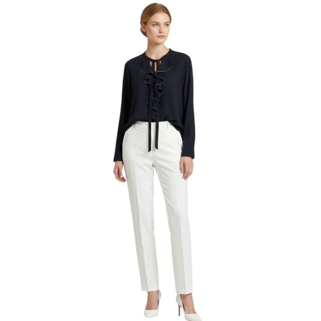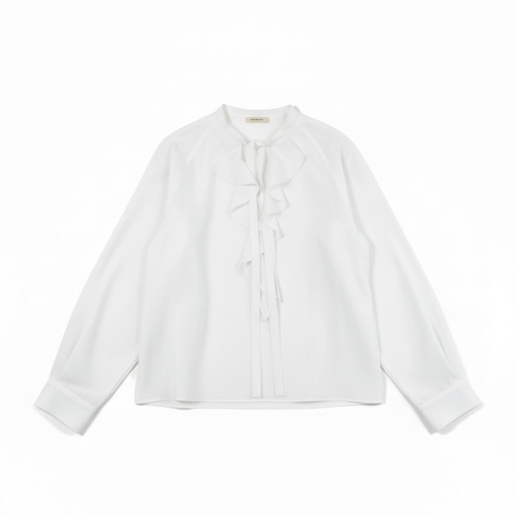 ■comment/ブランベールのブラウスです。 ナチュラルな表情でイージーケアと仕立て映えの良さが魅力の 素材を使用。フロントフリルリボンが目を引く カラーブラウスです。フリル端にボールチェーンを 施した、高度なテクニックもポイント。 光沢と透け感が、清涼感とエレガントな雰囲気を演出します。