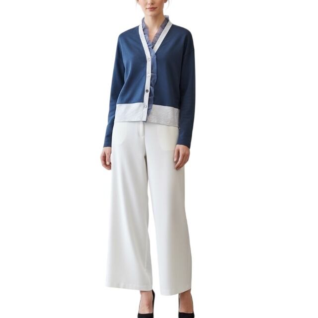 PUPULA ププラ シフォンフリルトリム バイカラー コットンストレッチ カットソーカーディガン【レディースファッション 30代 40代 50代 60代】