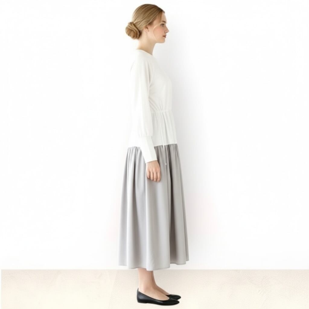 ■comment/春の立ち上がりから長い期間、活躍するベアポンチは、 安心感のある厚みと、綿とポリエステルを交互に編むことで 通気性と速乾性を併せ持ったマルチな素材。 スカート部分は上品な光沢感を持つコットンサテンを使用しました。 ウエスト部分をギャザー寄せすることでポイントデザインに。 長めの袖口切替が腕を細く見せる効果もあり、 大人コンフォートスタイルが完成します。