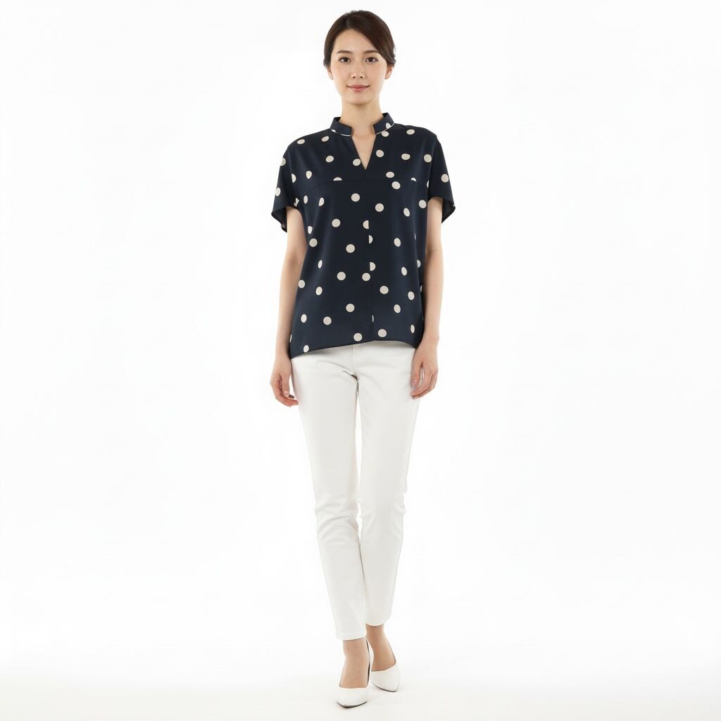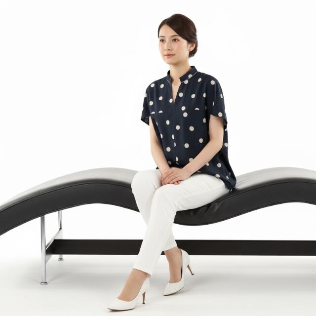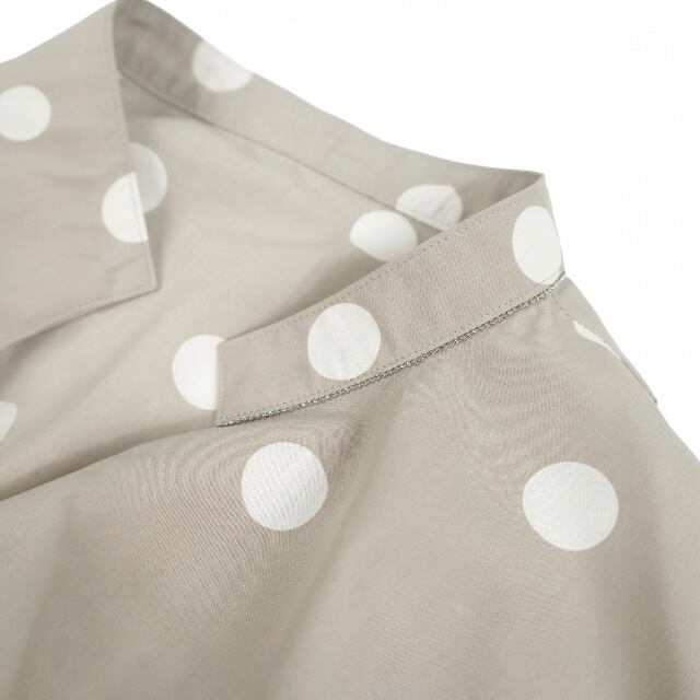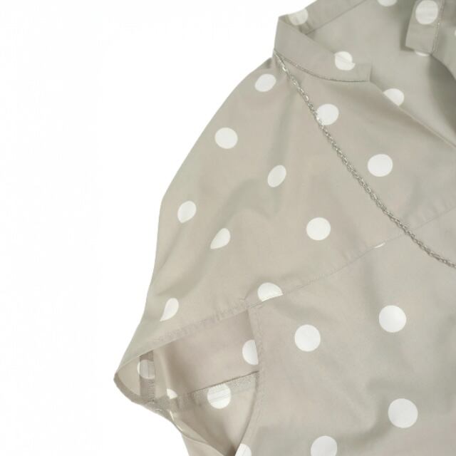 ■comment/ポリエステルなのにナチュラル感のあるスパンブロードを 下地にしたオリジナルドットプリントを使用。 折り紙のヤッコのような型です。 一枚で様になるデザインシルエットのかぶりブラウス。 細いスタンド襟つけ位置にボールチェーンを施し、 アクセントにしました。サングラスなどがかけられる グラスホルダーネックス付きです。