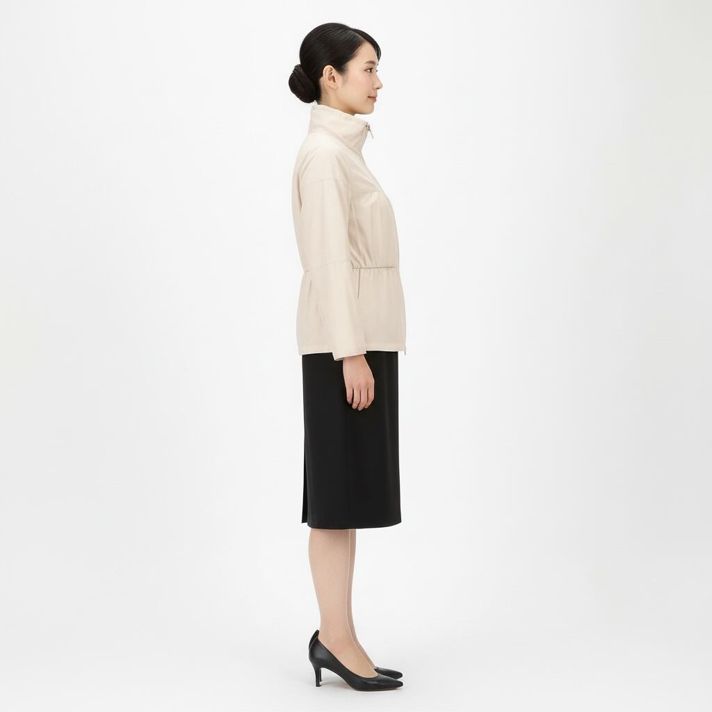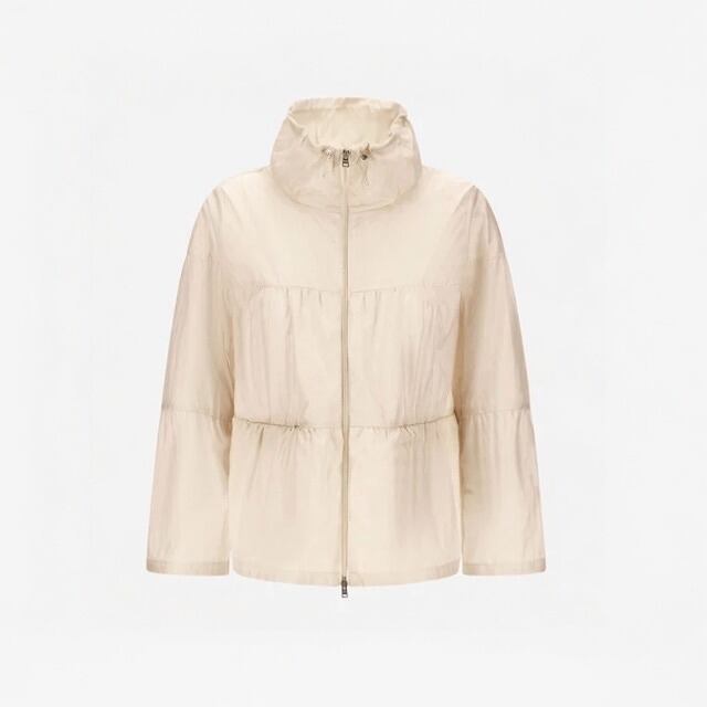 comment/20デニールのテクニカル素材を使用したジャケット。 特別な加工によりエレガントでさりげない光沢をまとっています。 ギャザリングを施したエレガントで立体的な仕立てが、フェミニンな印象を演出。 首元についたドローコードが冷たい風を防ぎます。 レギュラーフィット ドローコード付きスタンドカラー ダブルジップ開閉 シームジップポケット 首後ろにメタルのHernoロゴ 裏地なし