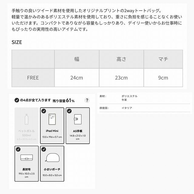 このトートバッグは、日常使いから特別なシーンまで幅広く活躍します。大きめの収納スペースに加え、内ポケットも充実しており、必要なアイテムをスッキリと整理できます。また、シンプルながらもトレンドを反映したデザインは、様々なファッションスタイルに合わせやすく、季節を問わずお使いいただけます。