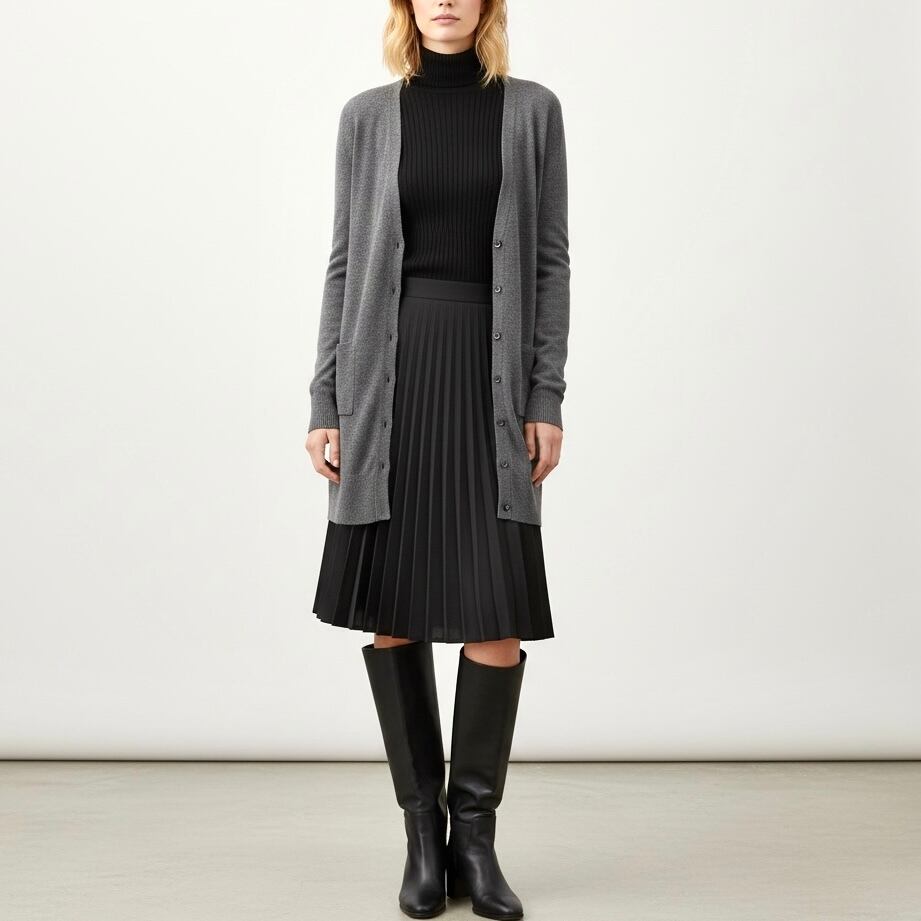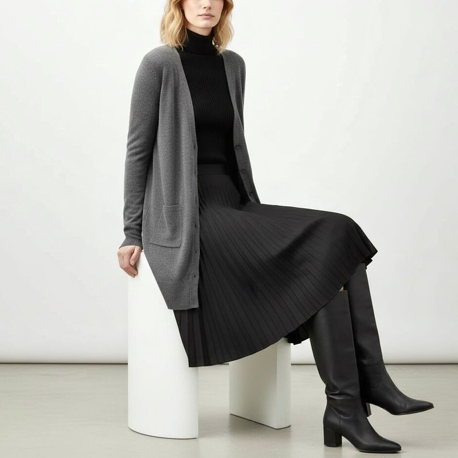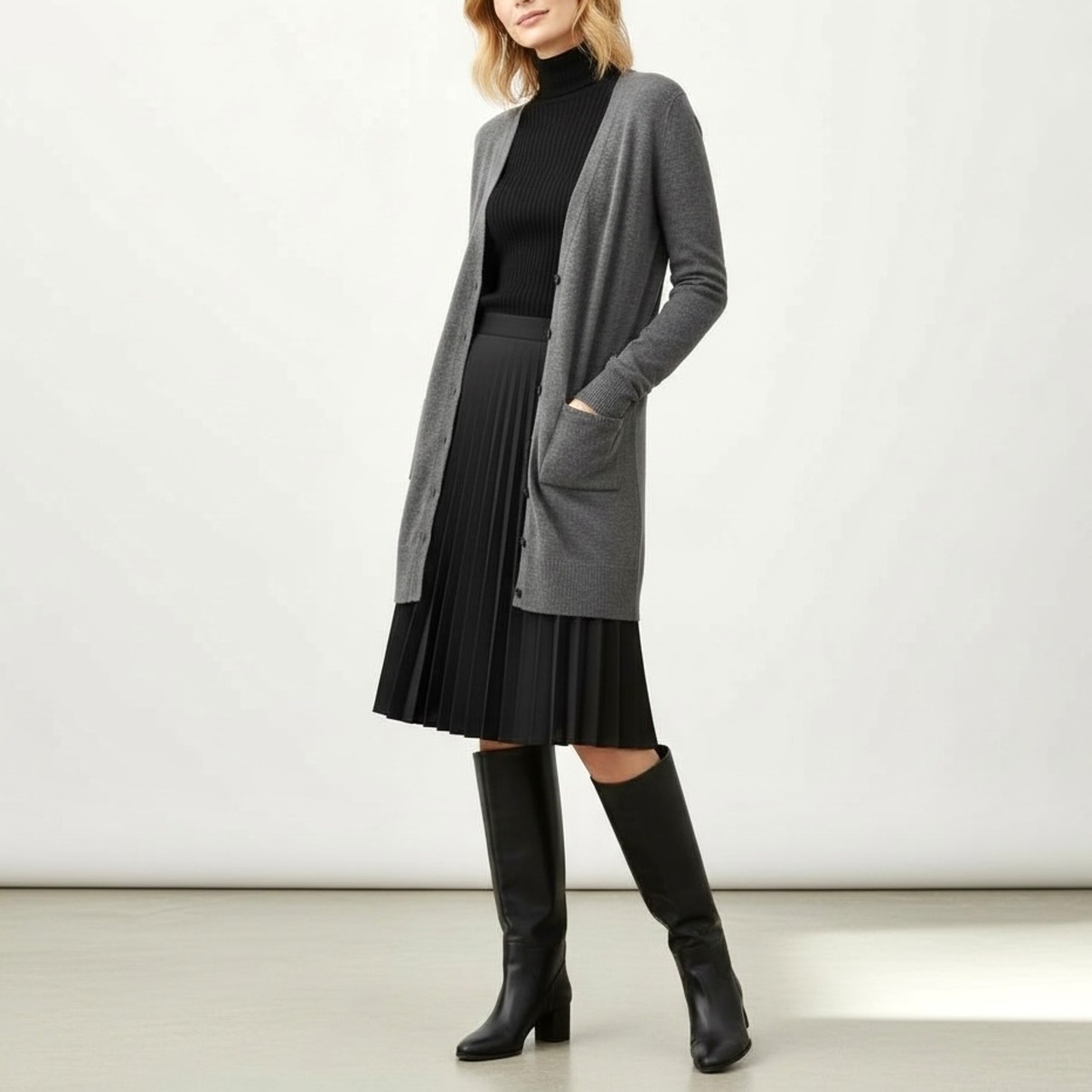 このカーディガンは、ミドルレングスの丈感が絶妙で、様々なスタイリングに合わせやすいアイテムです。カジュアルからフォーマルなシーンまで幅広く活躍でき、重ね着を楽しむのにもぴったりです。柔らかな質感と軽やかな着心地が、日々のコーディネートに上品さをプラスします。