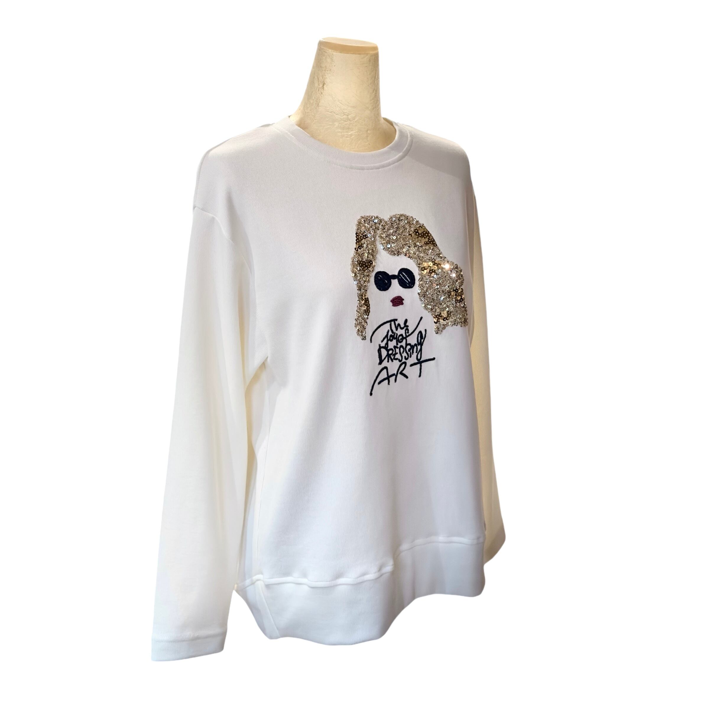 このプルオーバーは、スパンコールが施されたモチーフが特徴で、カジュアルさの中に一華やかさを加えることで、シンプルなボトムスとの相性も抜群です。デイリールックはもちろん、特別なお出かけにも合わせやすく、オールラウンドに活用できるアイテムとなっています。